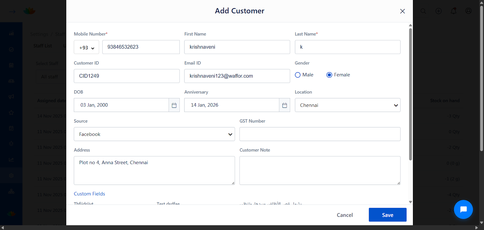 Fill in the remaining customer details such as First Name, Last Name, Email ID, and other optional fields.